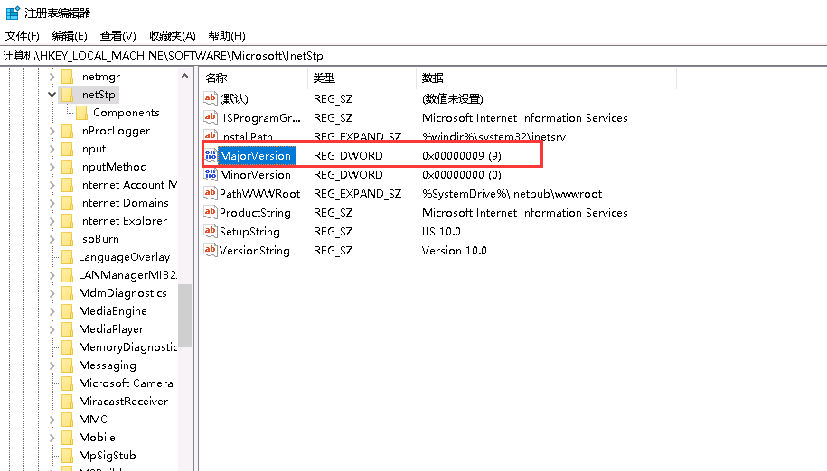 打開注冊(cè)表編輯器,在HKEY_LOCAL_MACHINESOFTWAREMicrosoftInetStp,把MajorVersion的值改為9之后,重啟一下IIS,就可以安裝了,安裝完成之后,再把MajorVersion的值改回10。